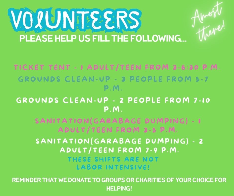 Volunteer Opportunities If you or your youth group is looking for a way to make money by helping out, email NOW to secure your spot… Email: Mclangley318@yahoo.com Here’s what we have left…